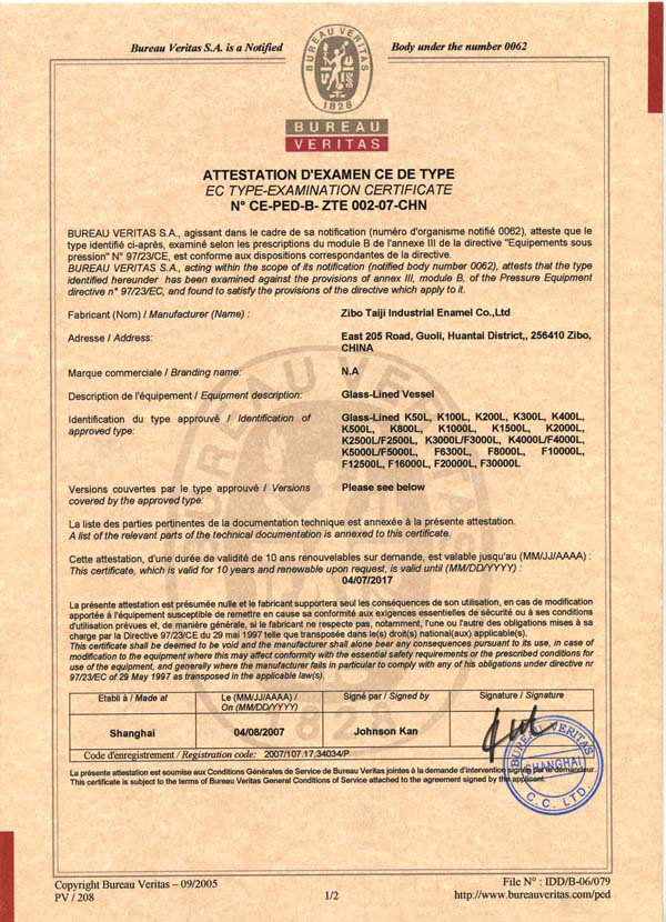 淄博太極在中國搪玻璃設備制造行業中首家通過ISO90001質量體系認證,并擁有美國ASME認證、歐洲PED認證以及國家部門頒發的搪玻璃制造許可證、進出口許可證和百余項榮譽證以及三十六項專利等。
